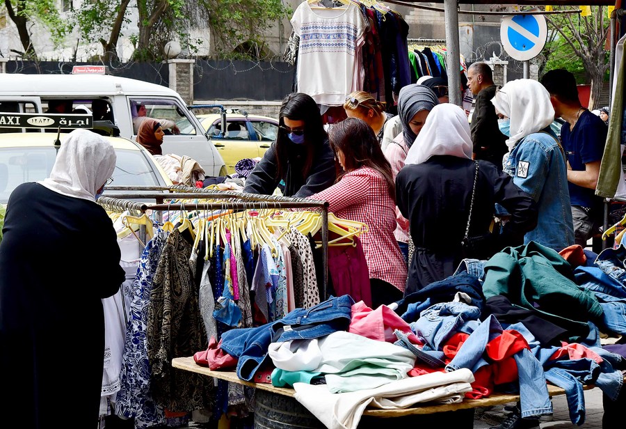 سوريون يتسوقون احتياجاتهم في سوق للملابس المستعملة في العاصمة السورية دمشق، 18 أبريل 2022. (شينخوا)