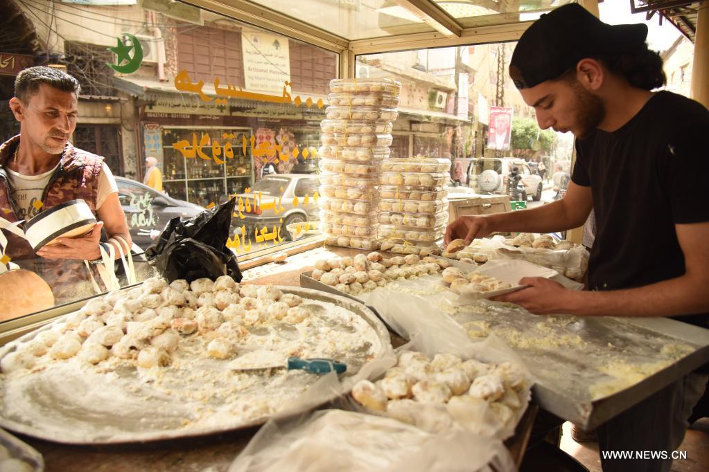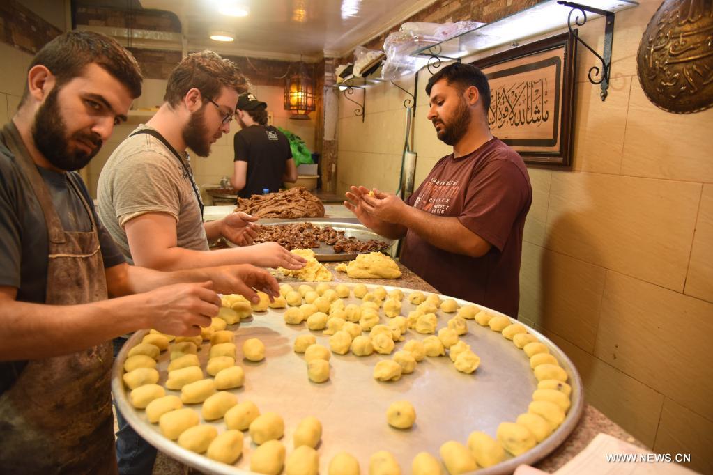 طرابلس (لبنان) 2 مايو 2022 (شينخوا) في الصورة الملتقطة يوم 30 أبريل 2022، عامل يحضر كعك "المعمول" التقليدي قبل عيد الفطر في طرابلس شمالي لبنان.