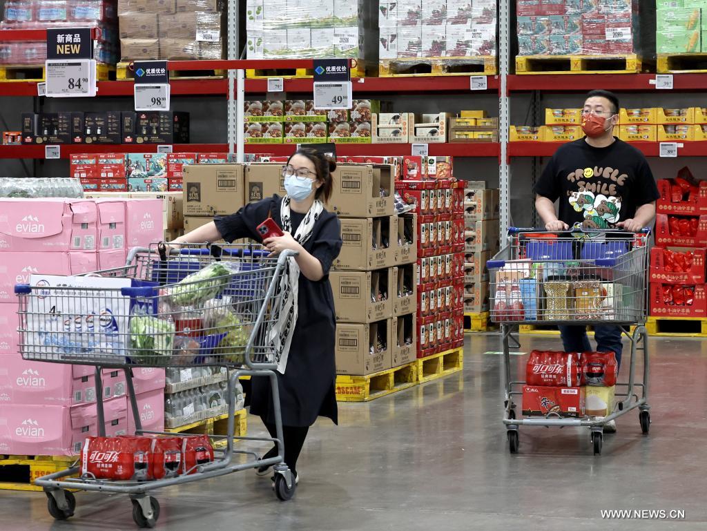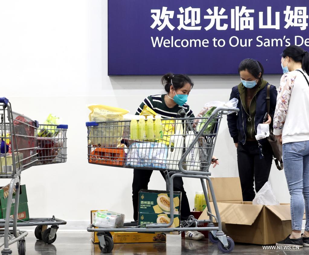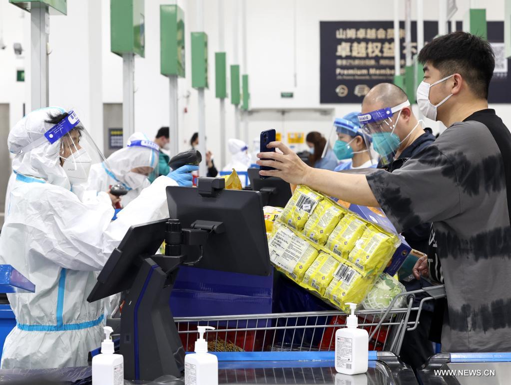 شانغهاي 3 مايو 2022 (شينخوا) في الصورة الملتقطة يوم 2 مايو 2022، عملاء يتسوقون في متجر "سامز كلوب" في بلدة بيتساي في حي بودونغ الجديد في شانغهاي بشرقي الصين. وبدأت شركات التجزئة الكبرى في شانغهاي في إعادة فتح متاجر السوبر ماركت الخاصة بها وسط عودة ظهور كوفيد-19 مؤخرًا.