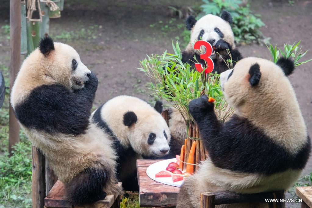 تشونغتشينغ 11 يونيو 2022 (شينخوا) في الصورة الملتقطة يوم 10 يونيو 2022، مجموعة من حيوانات الباندا العملاقة تستمتع بالغذاء خلال حفلة عيد ميلادها، في حديقة للحيوان ببلدية تشونغتشينغ جنوب غربي الصين.