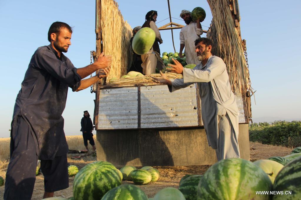قندوز 15 يونيو 2022 (شينخوا) في الصورة الملتقطة يوم 14 يونيو 2022، مزارعون يجمعون البطيخ في حقل في مقاطعة قندوز، أفغانستان.