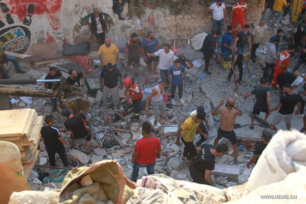 طرابلس (لبنان) 26 يونيو 2022 (شينخوا) في الصورة الملتقطة يوم 26 يونيو 2022، أشخاص يبحثون عن ناجين في الموقع حيث انهار مبنى في منطقة القبة بطرابلس شمالي لبنان. وقد توفي رضيع وأصيب عدة أشخاص آخرين اليوم (الأحد) بعد انهيار مبنى من ثلاثة طوابق في منطقة القبة بطرابلس، وفقا لما ذكرت الوكالة الوطنية للإعلام.