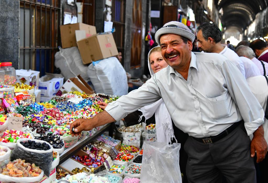 دمشق 5 يوليو 2022 (شينخوا) في الصورة الملتقطة يوم 4 يوليو 2022، أشخاص يشترون الحلوى من أجل عيد الأضحى المقبل في بزورية بالعاصمة السورية، دمشق.
