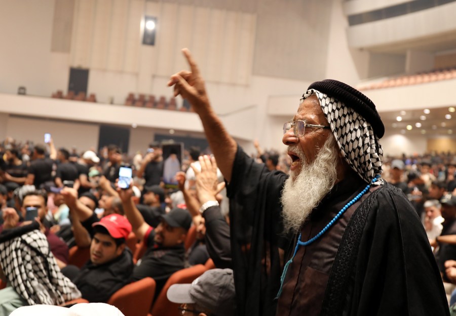 في الصورة الملتقطة أول أغسطس 2022، رجل مسن يهتف ضد الفساد خلال احتجاج داخل مبنى البرلمان في المنطقة الخضراء في العاصمة العراقية، بغداد. (شينخوا)