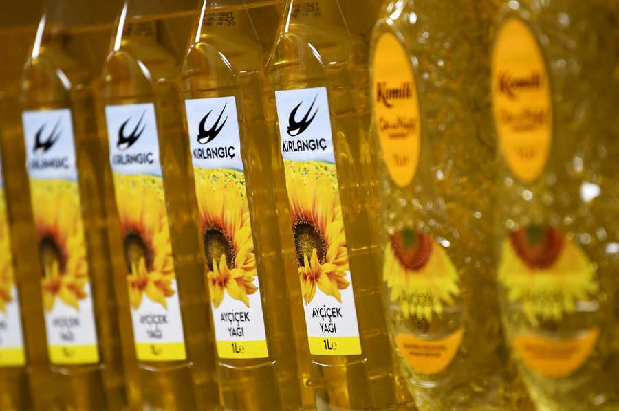 صورة التقطت في 7 مارس 2022 تظهر زجاجات من زيت عباد الشمس معروضة للبيع في متجر في اسطنبول بتركيا. (شينخوا)