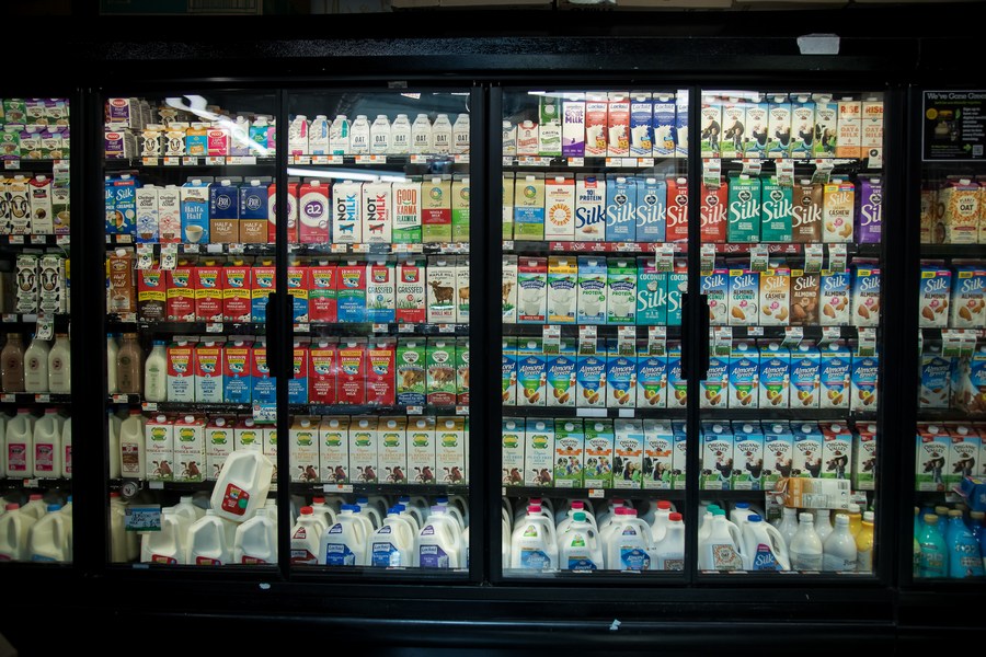 منتجات الألبان معروضة في محل بقالة في حي بروكلين في نيويورك بالولايات المتحدة في 10 يونيو 2022. (شينخوا)