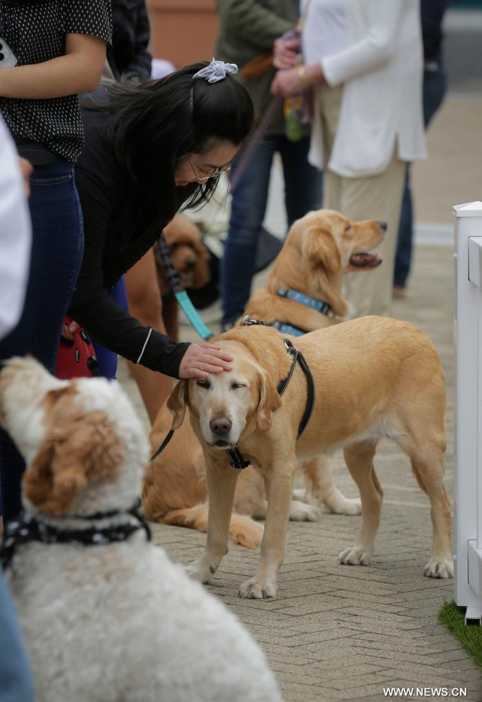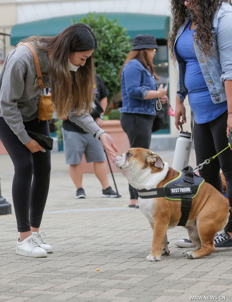 فانكوفر 27 أغسطس 2022 (شينخوا) في الصورة الملتقطة يوم 26 أغسطس 2022، سيدة تداعب كلبا خلال الاحتفال باليوم العالمي للكلاب في فانكوفر، كولومبيا البريطانية، بكندا.