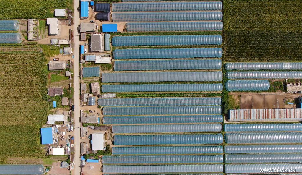 فاكو، لياونينغ 9 سبتمبر 2022 (شينخوا) في الصورة الجوية الملتقطة يوم 6 سبتمبر 2022، صوبات العنب في بلدة دينغجيافانغ بمحافظة فاكو في مدينة شنيانغ حاضرة مقاطعة لياونينغ شمال شرقي الصين. ودخل مؤخرا أكثر من 3500 مو (نحو 233 هكتارا) من العنب في بلدة دينغجيافانغ موسم الحصاد.