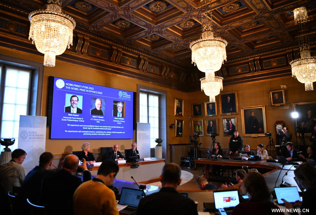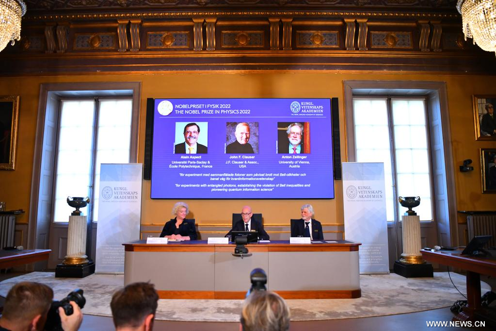 ستوكهولم 4 أكتوبر 2022 (شينخوا) فاز آلان أسبكت من فرنسا وجون إف كلوزر من الولايات المتحدة وأنطون زيلينجر من النمسا بجائزة نوبل في الفيزياء لعام 2022 عن "تجاربهم مع الفوتونات المتشابكة، وإثبات انتهاك تباينات 'بيل' والريادة في علم المعلومات الكمية"، حسبما أعلنت الأكاديمية الملكية السويدية للعلوم اليوم (الثلاثاء).