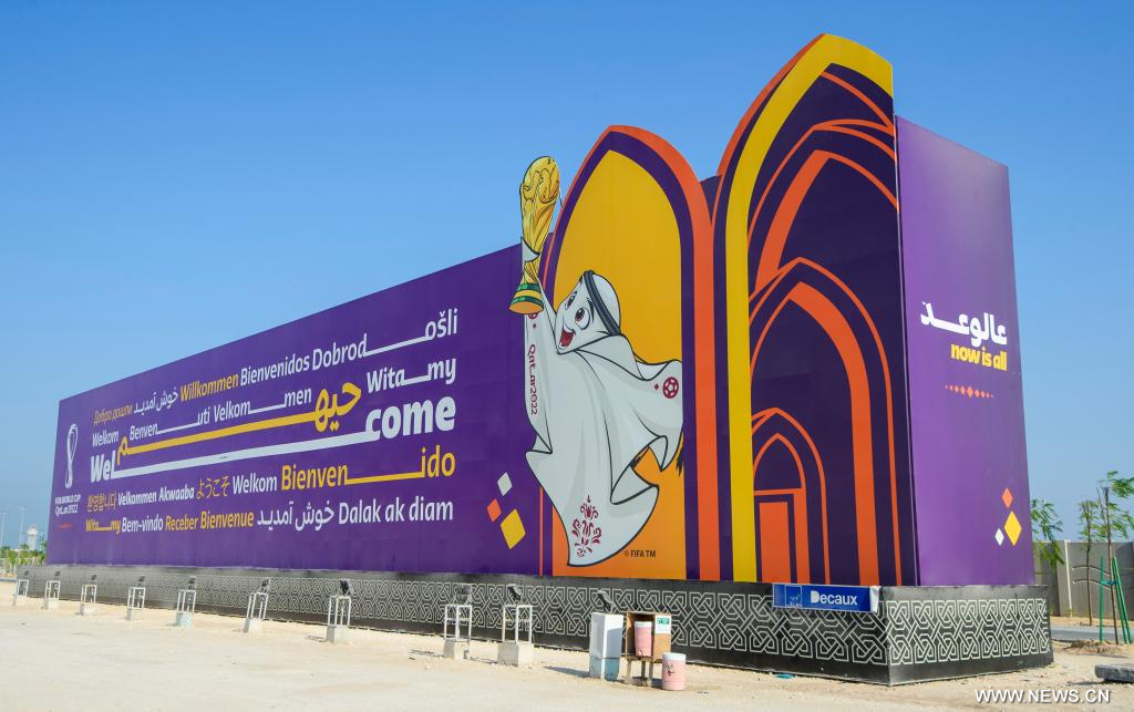 الدوحة 8 أكتوبر 2022 (شينخوا) في الصورة الملتقطة يوم 7 أكتوبر 2022، مشهد للوحة ترحيب ضخمة بشأن استضافة كأس العالم "فيفا قطر 2022"، على جانب أحد شوارع العاصمة القطرية الدوحة.