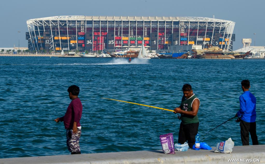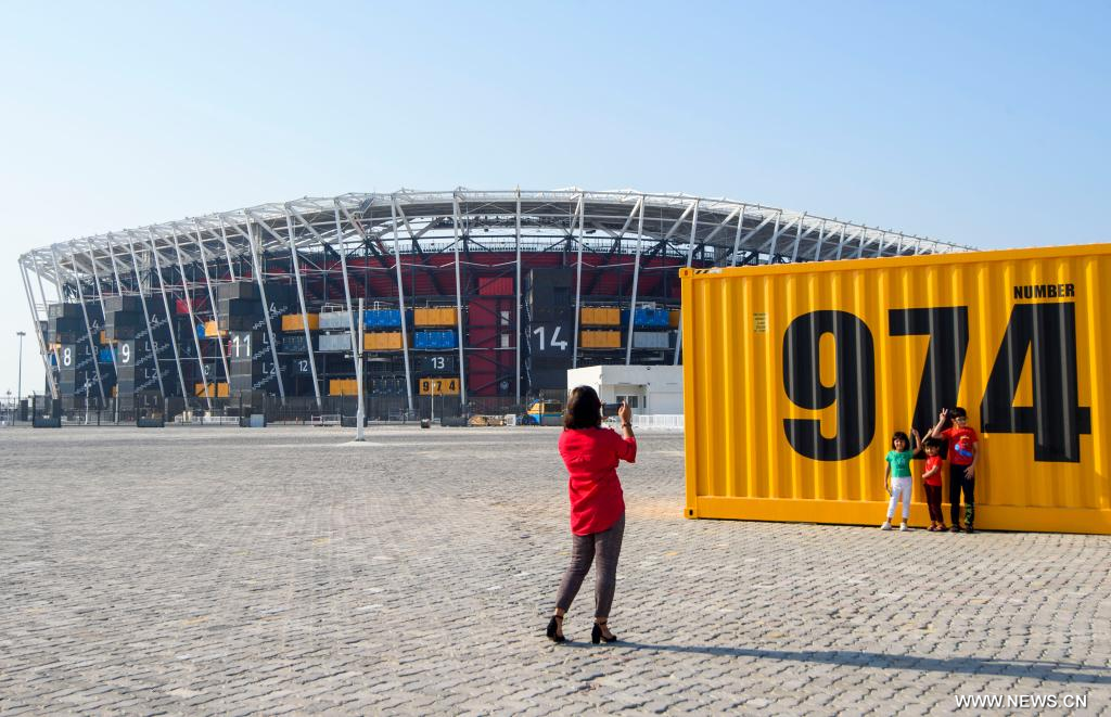 الدوحة 8 أكتوبر 2022 (شينخوا) في الصورة الملتقطة يوم 7 أكتوبر 2022، أشخاص يلتقطون صورا أمام "استاد 974"، أحد الملاعب التي تحتضن بطولة كأس العالم "فيفا قطر 2022"، في العاصمة القطرية الدوحة.