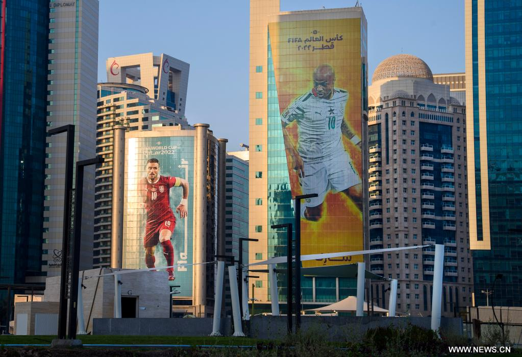 الدوحة 8 أكتوبر 2022 (شينخوا) في الصورة الملتقطة يوم 7 أكتوبر 2022، لافتات تحمل صورا للاعب الصربي دوشان تاديتش (يسارا) واللاعب الغاني أندري آيو في العاصمة القطرية الدوحة.