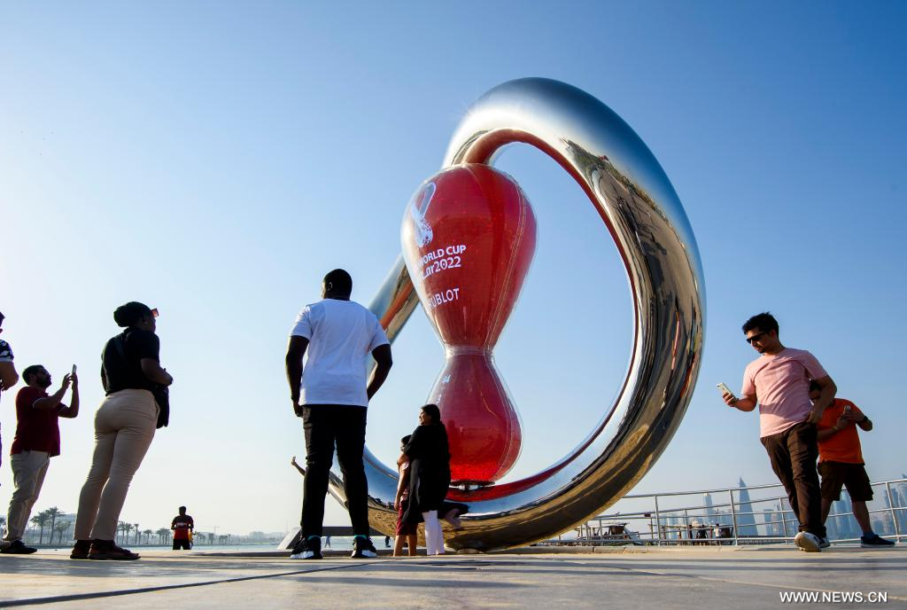 الدوحة 8 أكتوبر 2022 (شينخوا) في الصورة الملتقطة يوم 7 أكتوبر 2022، أشخاص يلتقطون صورا أمام ساعة العد التنازلي لبطولة "فيفا قطر 2022" في العاصمة القطرية الدوحة.