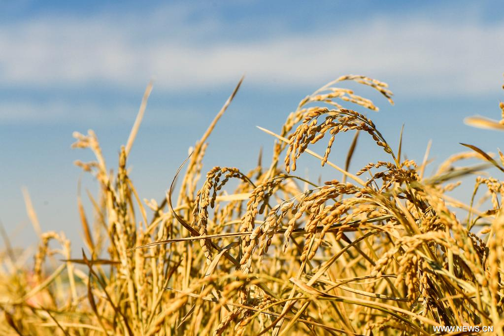 تشانغتشون 13 أكتوبر 2022 (شينخوا) في الصورة الملتقطة يوم 12 أكتوبر 2022، سنابل الأرز في بلدة هايتوه بمقاطعة جيلين شمال شرقي الصين.