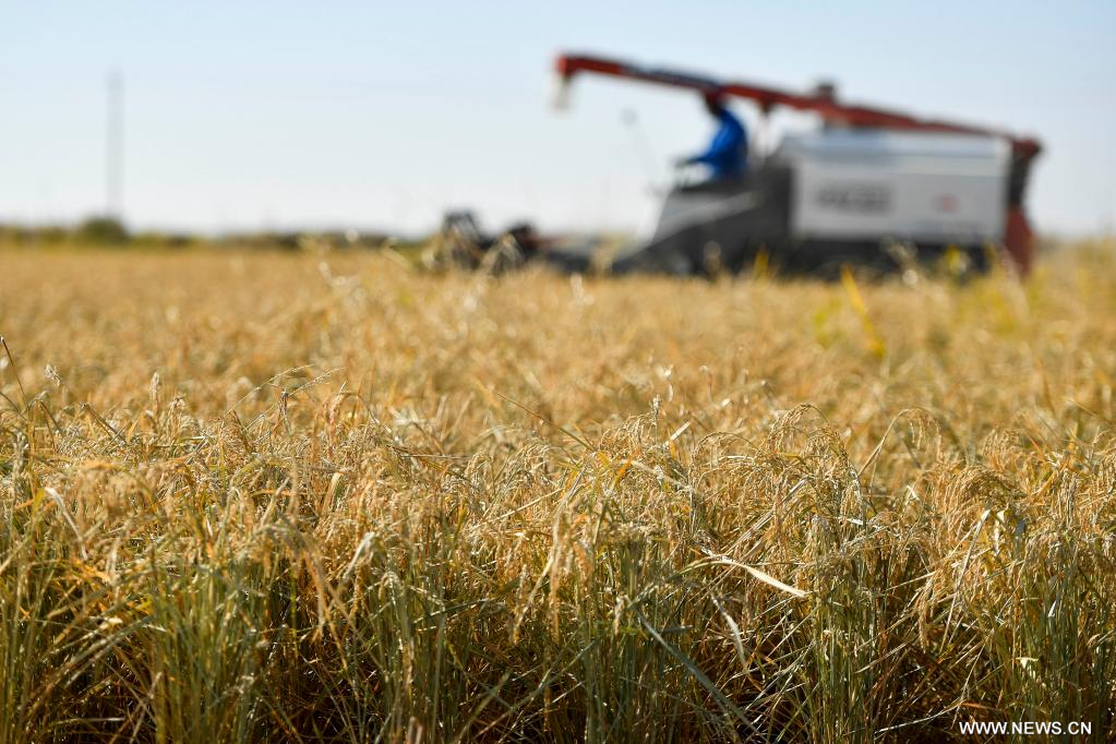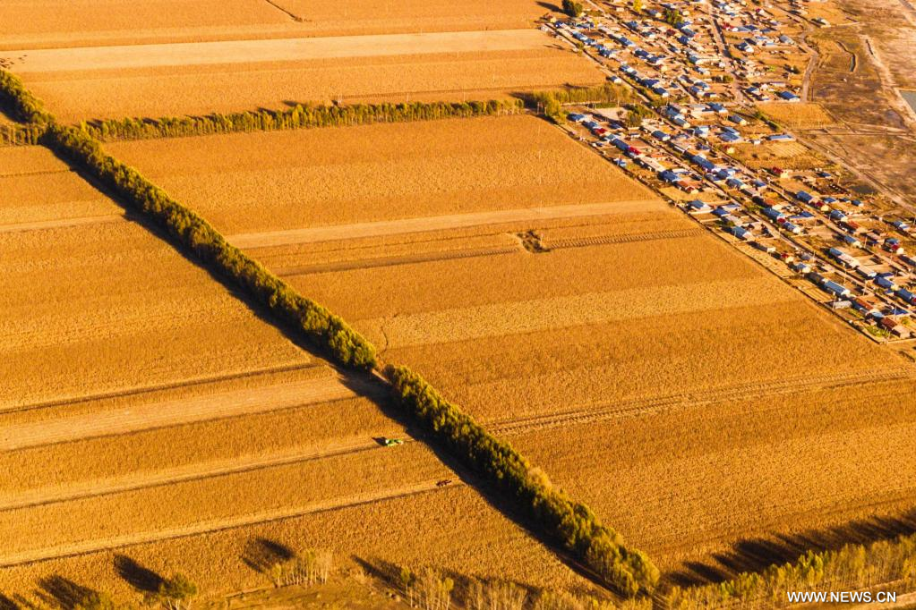 تشانغتشون 13 أكتوبر 2022 (شينخوا) في الصورة الملتقطة جوا يوم 11 أكتوبر 2022، آلة حصاد تعمل في حقل أرز بقرية وانفو في مقاطعة جيلين شمال شرقي الصين.