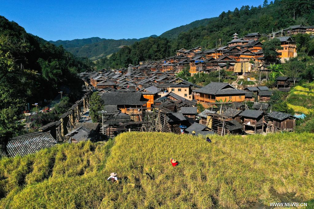 تسونغجيانغ 13 أكتوبر 2022 (شينخوا) في الصورة الملتقطة جوا يوم 12 أكتوبر 2022، أشخاص يحصدون الأرز في قرية تشانلي في محافظة تسونغجيانغ في مقاطعة قويتشو جنوب غربي الصين.