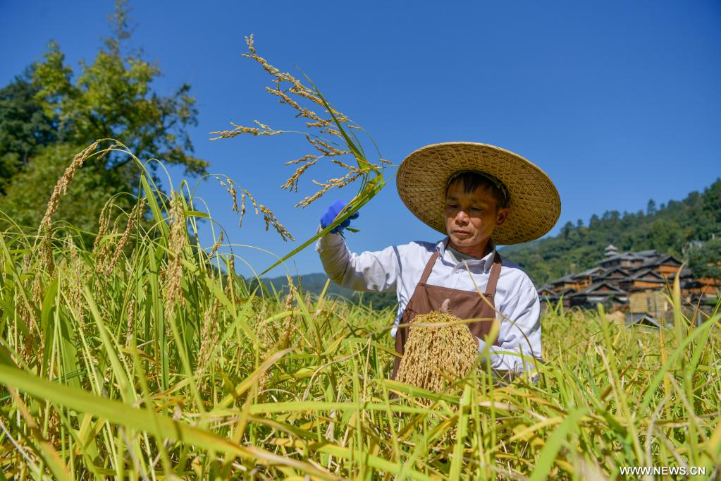 تسونغجيانغ 13 أكتوبر 2022 (شينخوا) في الصورة الملتقطة يوم 12 أكتوبر 2022، شخص يحصد الأرز في قرية تشانلي في محافظة تسونغجيانغ في مقاطعة قويتشو جنوب غربي الصين.