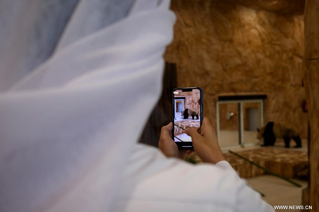 في الصورة الملتقطة يوم 19 أكتوبر 2022، رجل يلتقط صورة للباندا العملاق في بيت مخصص للباندا في منطقة الخور بالعاصمة القطرية، الدوحة. وصل زوج الباندا العملاق الصيني "سهيل" و"ثريا" صباح اليوم (الأربعاء) إلى الدوحة، في أول رحلة للباندا إلى منطقة الشرق الأوسط.
