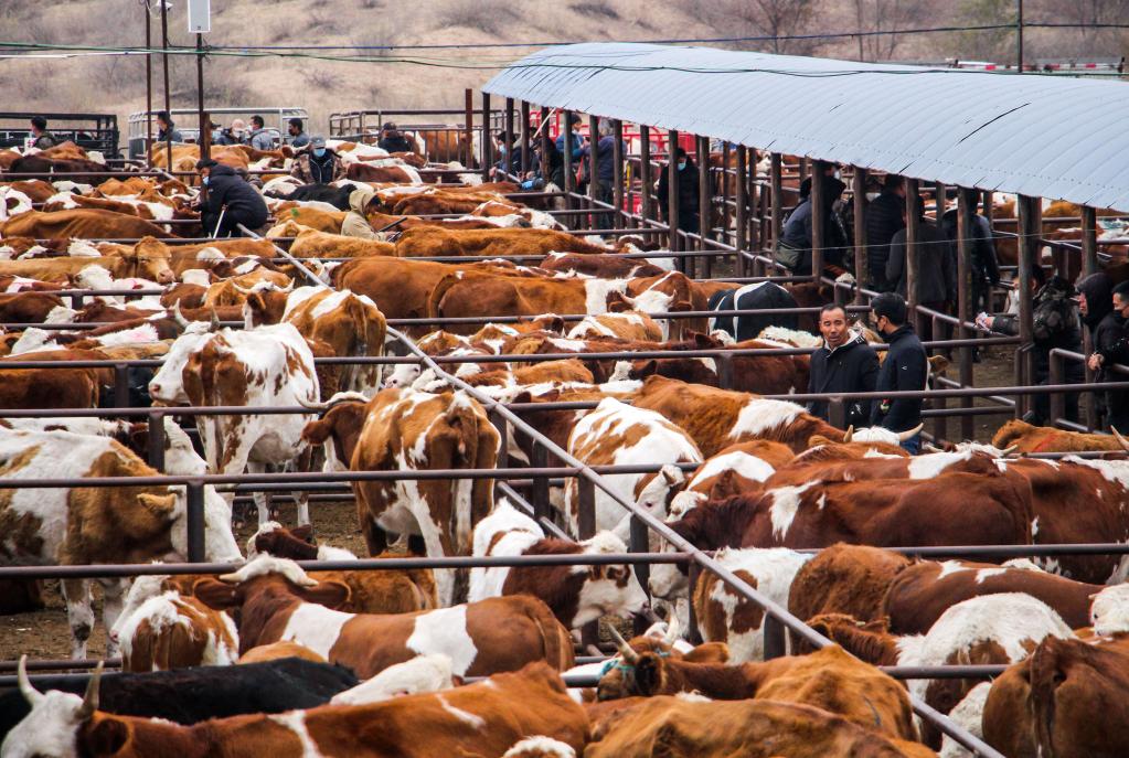 تونغلياو 31 أكتوبر 2022 (شينخوا) في الصورة الملتقطة يوم 30 أكتوبر 2022، جانب من سوق لتجارة البقر في مدينة تونغلياو بمنطقة منغوليا الداخلية بشمالي الصين. ويتجاوز حجم تجارة البقر في السوق 500 ألف رأس سنويا، حيث تبلغ قيمة التجارة أكثر من 5 مليارات يوان (حوالي 696.7 مليون دولار أمريكي) سنويا. وأصبحت صناعة تربية البقر المنتج للحوم طريقة هامة لزيادة دخل الرعاة المحليين مع تطورها المطرد خلال السنوات الأخيرة.
