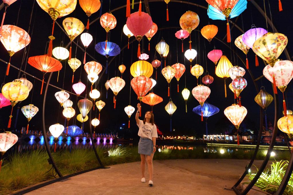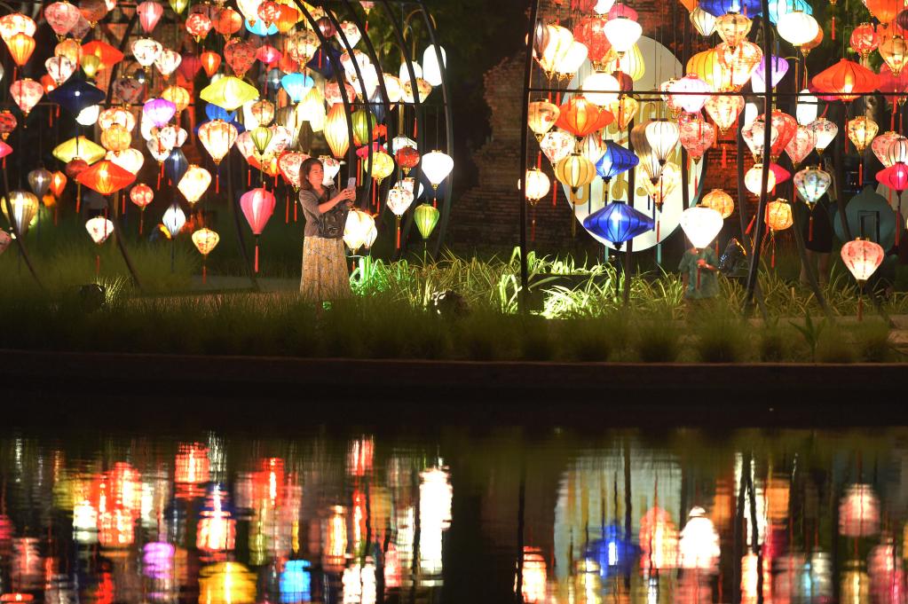 ساموت براكان 5 نوفمبر 2022 (شينخوا) في الصورة الملتقطة يوم 4 نوفمبر 2022، امرأة تلتقط صورا في مهرجان تايلاند الدولي للفوانيس والأطعمة في موانغبوران بمقاطعة ساموت براكان في تايلاند.