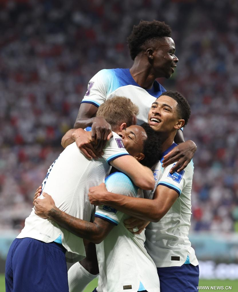 في الصورة الملتقطة يوم 21 نوفمبر 2022، لاعبو منتخب إنجلترا يحتفلون بعد تسجيل هدف خلال المباراة ضد منتخب إيران ضمن المجموعة الثانية في مونديال فيفا قطر 2022 على استاد خليفة الدولي في الدوحة.