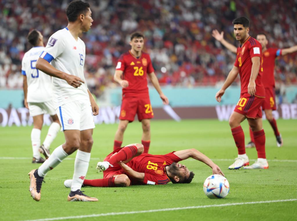 الدوحة 23 نوفمبر 2022 (شينخوا) في الصورة الملتقطة يوم 23 نوفمبر 2022، جوردي ألبا لاعب منتخب إسبانيا يسقط أرضا خلال مباراة إسبانيا وكوستاريكا ضمن المجموعة الخامسة في بطولة كأس العالم لكرة القدم قطر 2022، في استاد الثمامة بالعاصمة القطرية، الدوحة.