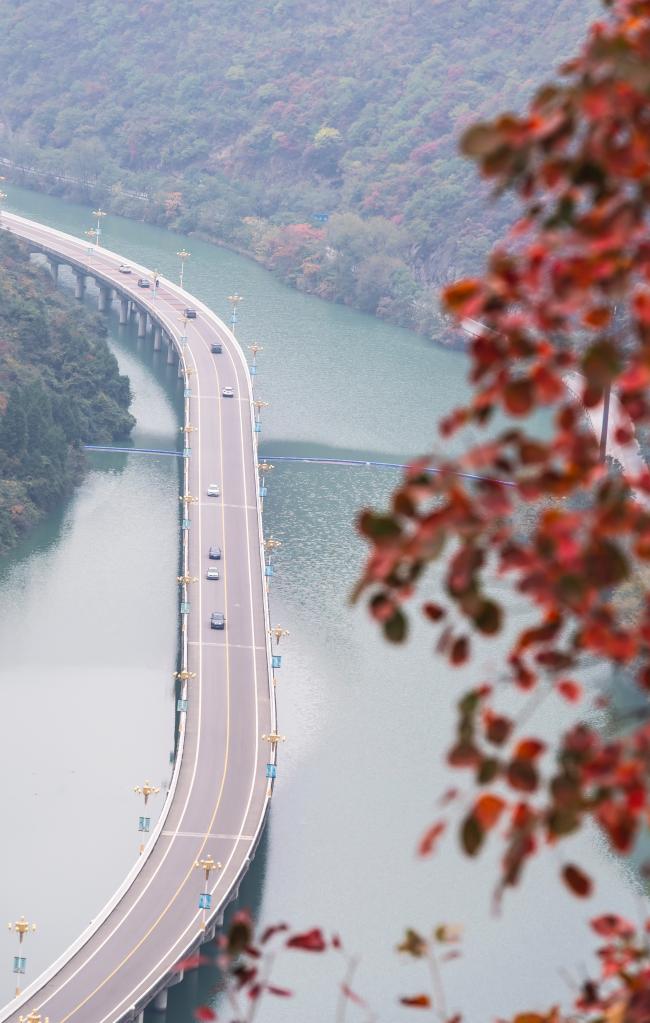 شينغشان 28 نوفمبر 2022 (شينخوا) في الصورة الملتقطة يوم 27 نوفمبر 2022، منظر جوي للطريق العام المبني على سطح المياه في محافظة شينغشان بمقاطعة هوبي في وسط الصين، حيث سعت المحافظة إلى بناء الطرق والجسور على سطح المياه وتيسير النقل المحلي بدلا من حفر الأنفاق داخل الجبال، لتشكل أوراق الأشجار الحمراء والسيارات السارية على الطريق العام الطويل الممتد مناظر ممتعة.