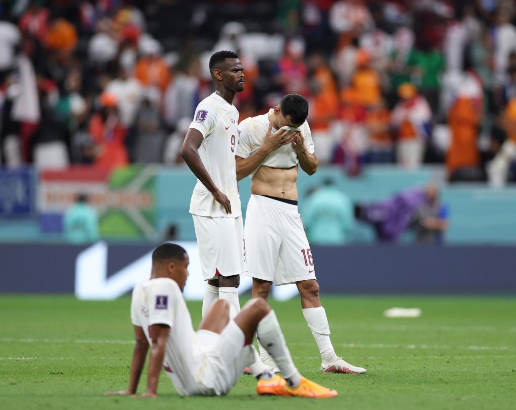 الخور 29 نوفمبر 2022 (شينخوا) في الصورة الملتقطة يوم 29 نوفمبر 2022، لاعبو قطر يشعرون بالحزن عقب خسارتهم في مباراة هولندا وقطر في إطار المجموعة الأولى في كأس العالم لكرة القدم قطر 2022 في استاد البيت، في مدينة الخور القطرية.