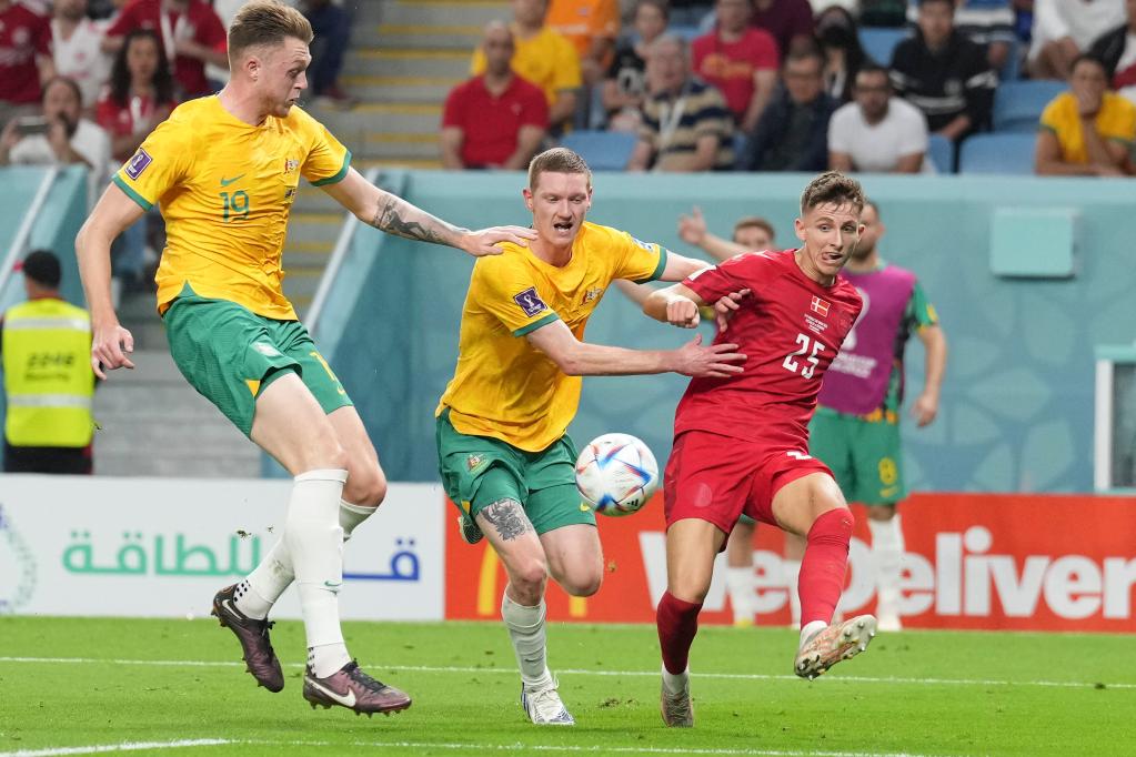 الوكرة 30 نوفمبر 2022 (شينخوا) في الصورة الملتقطة يوم 30 نوفمبر 2022، يسبر ليندستروم (يمين الصورة)، لاعب منتخب الدنمارك، يمرر الكرة خلال مباراة منتخبي أستراليا والدنمارك ضمن المجموعة الرابعة في كأس العالم لكرة القدم قطر 2022، على ملعب استاد الجنوب في مدينة الوكرة القطرية.