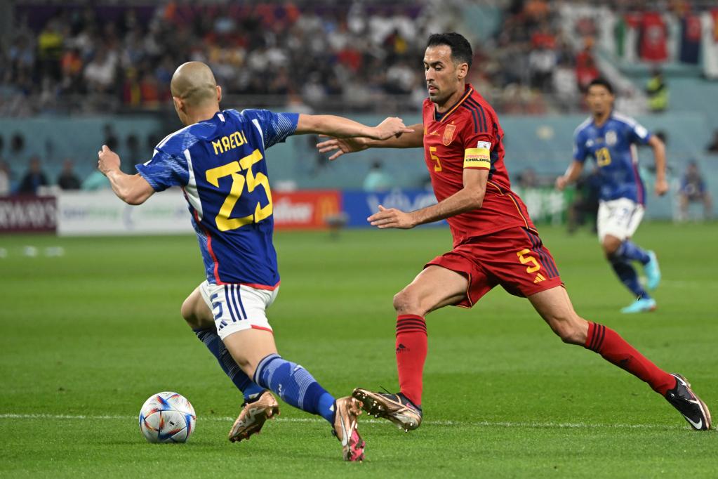 الدوحة أول ديسمبر 2022 (شينخوا) في الصورة الملتقطة أول ديسمبر 2022، الياباني مايدا دايزن (يسار) في منافسة على الكرة مع الإسباني سيرخيو بوسكيتس، خلال مباراة اليابان وإسبانيا ضمن المجموعة الخامسة في كأس العالم لكرة القدم 2022، على ملعب استاد خليفة الدولي في الدوحة بقطر.