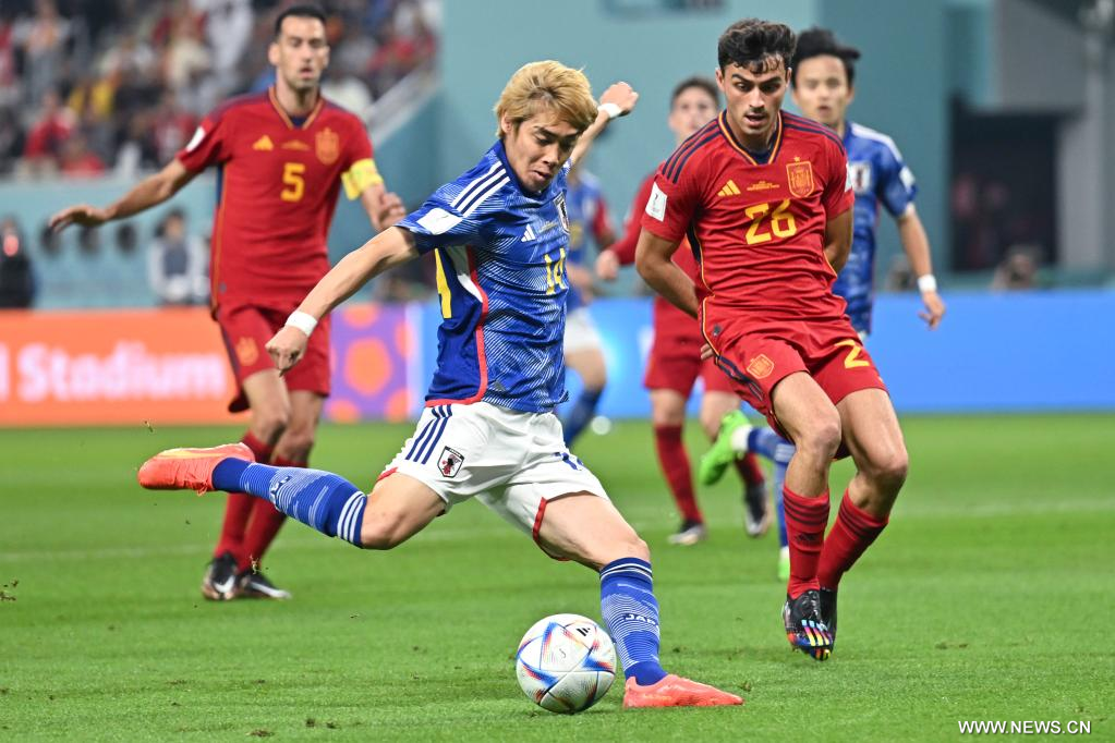 في الصورة الملتقطة أول ديسمبر 2022، الياباني إيتو جونيا (الثاني لليسار) يسدد الكرة خلال مباراة اليابان وإسبانيا ضمن المجموعة الخامسة في كأس العالم لكرة القدم 2022، على ملعب استاد خليفة الدولي في الدوحة بقطر.