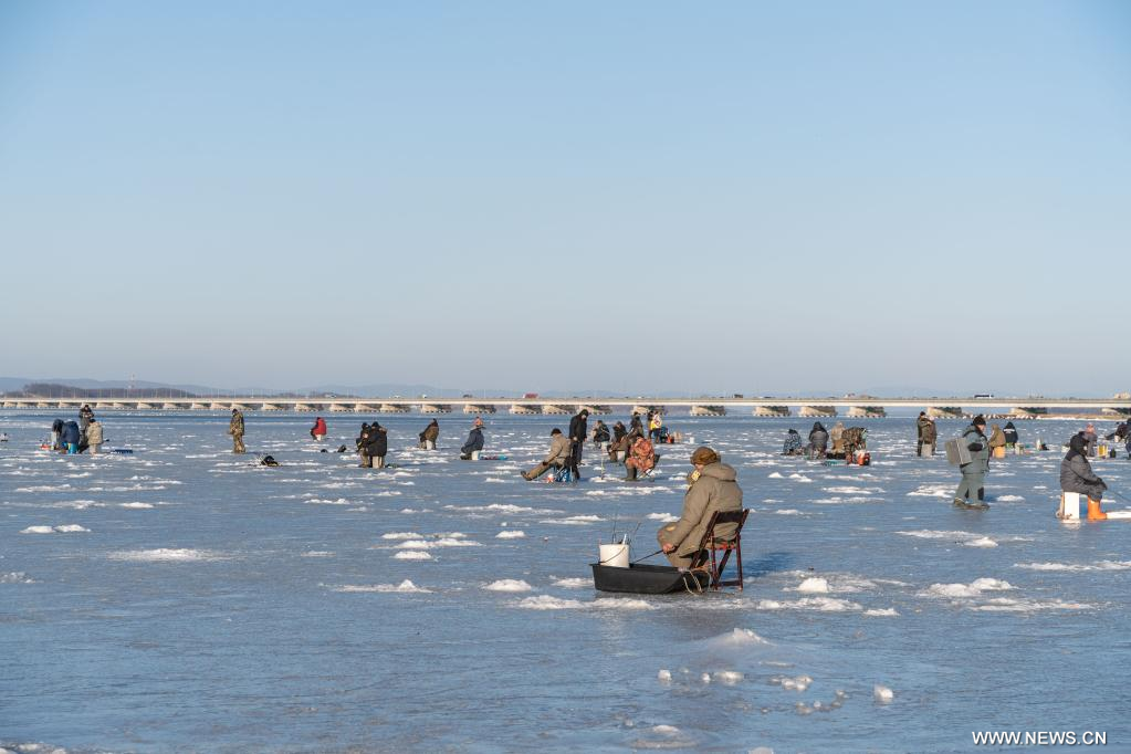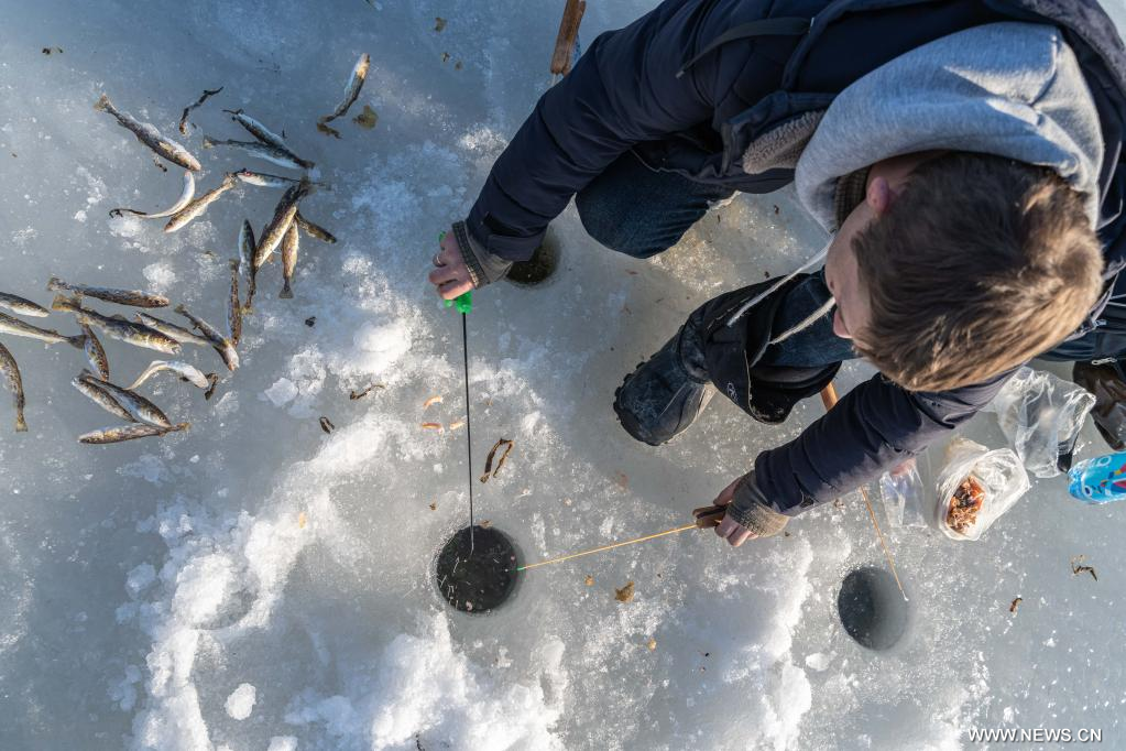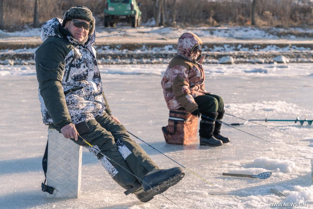 فلاديفوستوك 10 ديسمبر 2022 (شينخوا) في الصورة الملتقطة يوم 10 ديسمبر 2022، رجل يصطاد السمك في المياه الثلجية بخليج آمور في مدينة فلاديفوستوك الروسية.