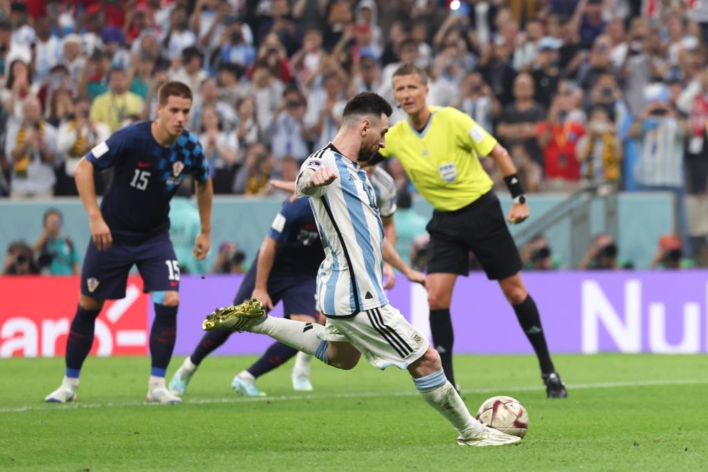 لوسيل 13 ديسمبر 2022 (شينخوا) في الصورة الملتقطة يوم 13 ديسمبر 2022، اللاعب الأرجنتيني ليونيل ميسي يسدد ركلة جزاء ويسجل الهدف الأول لفريقه، خلال مباراة الأرجنتين وكرواتيا في الدور نصف النهائي بكأس العالم لكرة القدم قطر 2022.