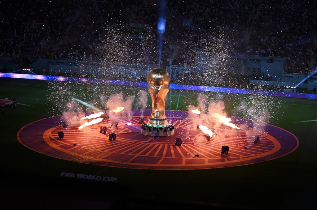 في الصورة الملتقطة يوم 17 ديسمبر 2022، إقامة عروض ألعاب نارية قبل انطلاق مباراة تحديد المركز الثالث بين منتخبي كرواتيا والمغرب في منافسات كأس العالم فيفا قطر 2022 على استاد خليفة الدولي في العاصمة القطرية الدوحة.