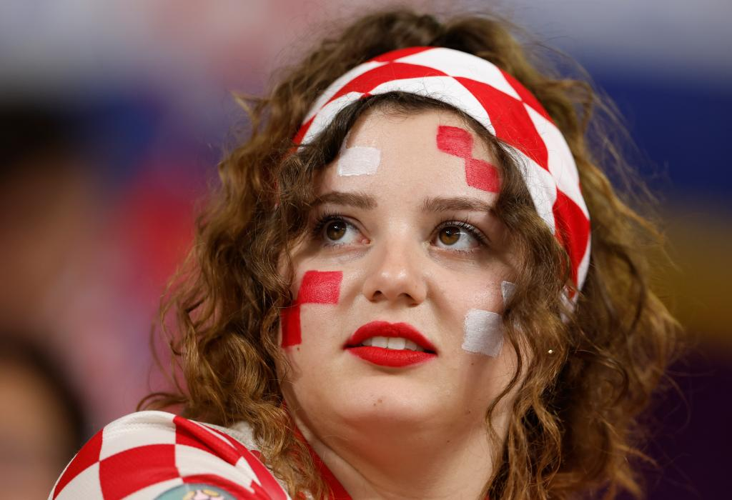 في الصورة الملتقطة يوم 17 ديسمبر 2022، مشجعة كرواتية قبل انطلاق مباراة منتخب بلادها أمام المنتخب المغربي في مباراة تحديد المركز الثالث من منافسات كأس العالم فيفا قطر 2022 على استاد خليفة الدولي في العاصمة القطرية الدوحة.