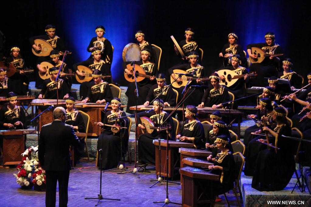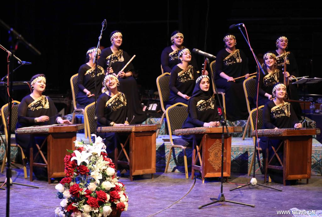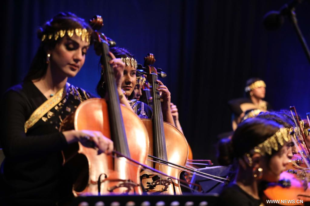 بغداد 23 ديسمبر 2022 (شينخوا) في الصورة الملتقطة يوم 22 ديسمبر 2022، عازفات من فرقة سومريات الموسيقية يعزفن على المسرح الوطني العراقي في العاصمة العراقية بغداد. أقامت الفرقة النسائية العراقية حفلها الموسيقي الأول هنا مساء يوم الخميس.