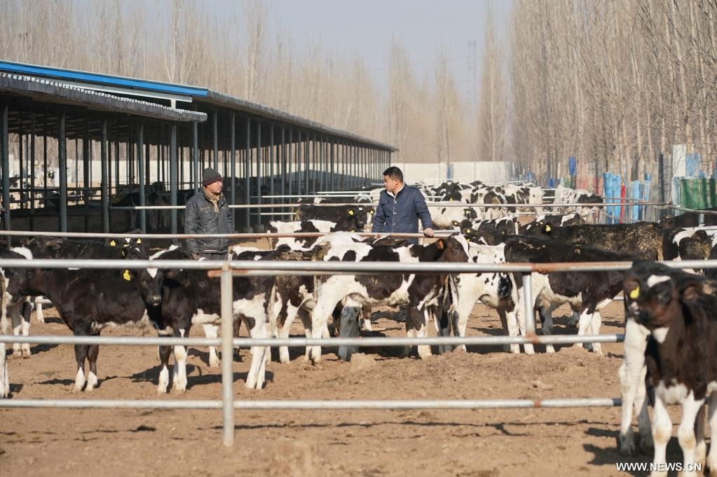 شينغتاي 28 ديسمبر 2022 (شينخوا) في الصورة الملتقطة يوم 28 ديسمبر 2022، تشنغ بنغ في يعمل مع شخص آخر في حظيرة أبقار في قرية شاليوانغ بمحافظة شينخه بمقاطعة خبي شمالي الصين. بعد التخرج في عام 2010، أصبح تشنغ بنغ في، الذي تخصص في تربية الحيوانات والطب البيطري في الجامعة، تقنيا وعمل في إحدى المراعي في بكين. في عام 2019، عاد إلى مسقط رأسه، محافظة شينخه بمقاطعة خبي، لبدء عمل تجاري. في الوقت الحاضر، يوجد بمزرعة الأبقار الخاصة به أكثر من 700 عجل. كما أنه يشجع ويساعد القرويين الآخرين على زيادة دخلهم من التجارة نفسها.