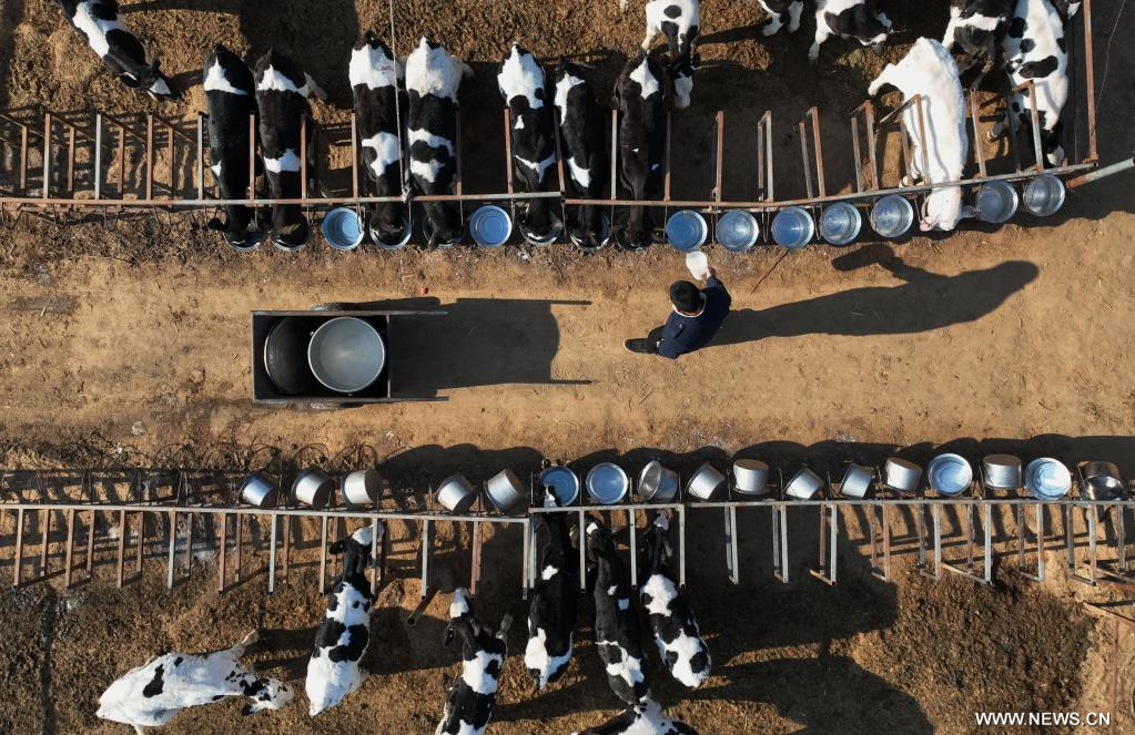 شينغتاي 28 ديسمبر 2022 (شينخوا) في الصورة الجوية الملتقطة يوم 28 ديسمبر 2022، تشنغ بنغ في يغذي العجول في حظيرة أبقار في قرية شاليوانغ بمحافظة شينخه بمقاطعة خبي شمالي الصين. بعد التخرج في عام 2010، أصبح تشنغ بنغ في، الذي تخصص في تربية الحيوانات والطب البيطري في الجامعة، تقنيا وعمل في إحدى المراعي في بكين. في عام 2019، عاد إلى مسقط رأسه محافظة شينخه بمقاطعة خبي لبدء عمل تجاري. في الوقت الحاضر يوجد بمزرعة الأبقار الخاصة به أكثر من 700 عجل. كما أنه يشجع ويساعد القرويين الآخرين على زيادة دخلهم من التجارة نفسها.