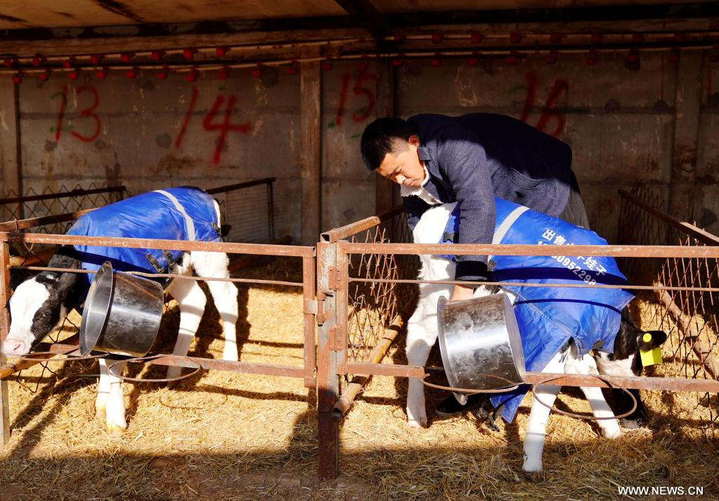 شينغتاي 28 ديسمبر 2022 (شينخوا) في الصورة الملتقطة يوم 28 ديسمبر 2022، تشنغ بنغ في يغطي عجلا بغطاء لتدفئته في حظيرة للأبقار في قرية شاليوانغ بمحافظة شينخه بمقاطعة خبي شمالي الصين. بعد التخرج في عام 2010، أصبح تشنغ بنغ في، الذي تخصص في تربية الحيوانات والطب البيطري في الجامعة، تقنيا وعمل في إحدى المراعي في بكين. في عام 2019، عاد إلى مسقط رأسه، محافظة شينخه بمقاطعة خبي، لبدء عمل تجاري. في الوقت الحاضر، يوجد بمزرعة الأبقار الخاصة به أكثر من 700 عجل. كما أنه يشجع ويساعد القرويين الآخرين على زيادة دخلهم من التجارة نفسها.