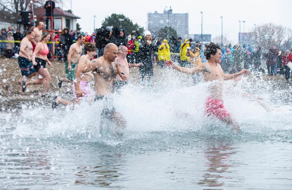 تورونتو 2 يناير 2023 (شينخوا) في الصورة الملتقطة يوم أول يناير 2023، مشاركون يجرون داخل بحيرة أونتاريو خلال فعاليات "تورنتو بولار بير ديب 2023" في مدينة تورنتو بكندا. تحدى نحو 700 مشارك المياه الباردة هنا احتفالا بالعام الجديد وجمع الأموال للأعمال الخيرية يوم الأحد.