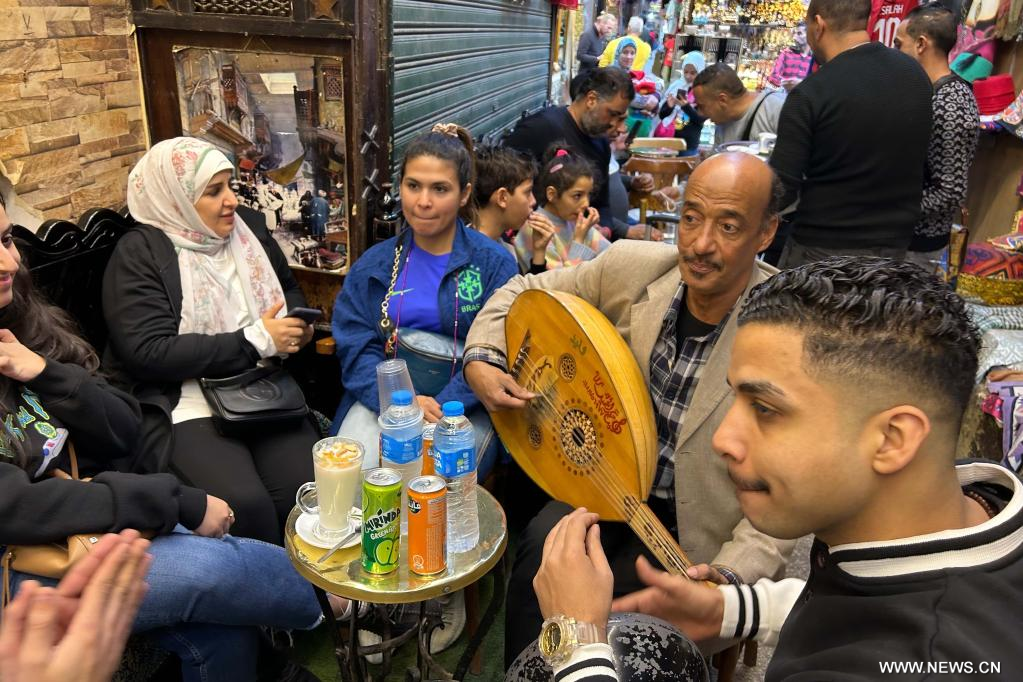 في الصورة الملتقطة يوم 6 يناير 2023، سياح يقضون وقتا ممتعا في سوق خان الخليلي الشهيرة في العاصمة المصرية، القاهرة. يتوقع أصحاب المتاجر في سوق خان الخليلي، وهي سوق سياحية شهيرة في القاهرة، عودة السياح الصينيين عقب إعلان الصين عن تخفيف قيود السفر اعتبارا من 8 يناير.