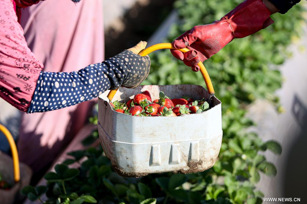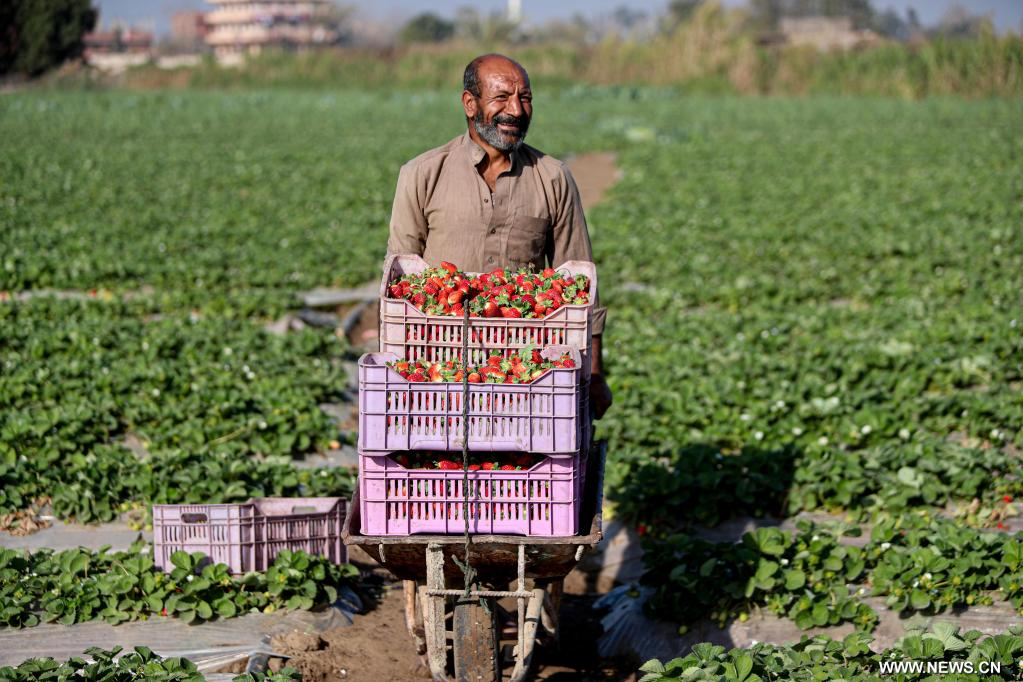 القليوبية 12 يناير 2023 (شينخوا) في الصورة الملتقطة يوم 12 يناير 2023، رجل يحمل سلال ثمار الفراولة المحصودة حديثا في حقل في محافظة القليوبية بمصر. دخلت مصر موسم حصاد الفراولة الشتوي.