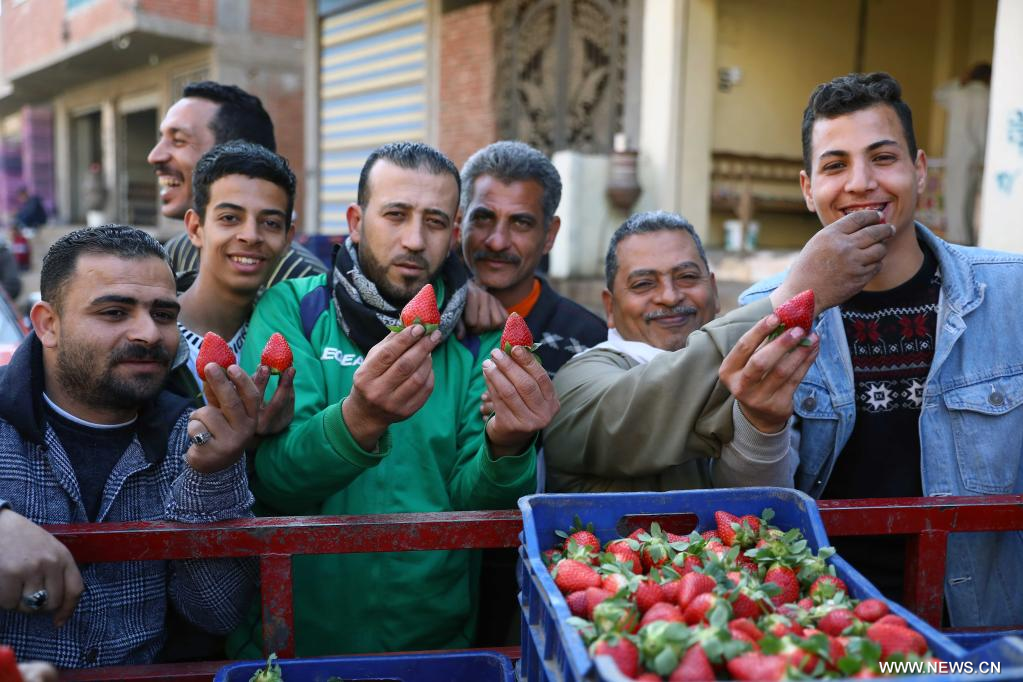 القليوبية 12 يناير 2023 (شينخوا) في الصورة الملتقطة يوم 12 يناير 2023، أشخاص يشترون الفراولة في سوق في محافظة القليوبية بمصر. دخلت مصر موسم حصاد الفراولة الشتوي.