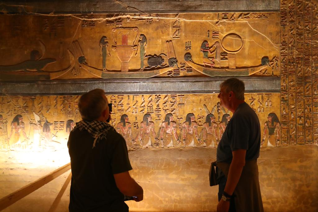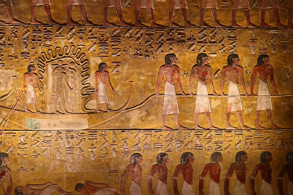 الأقصر 25 يناير 2023 (شينخوا) في الصورة الملتقطة يوم 24 يناير 2023، مشهد لنقوش بارزة على جدران مقبرة الملك سيتي الأول بوادي الملوك في محافظة الأقصر بمصر. تشتهر مقبرة الملك سيتي الأول بنقوشها الملونة المحفوظة جيدا.