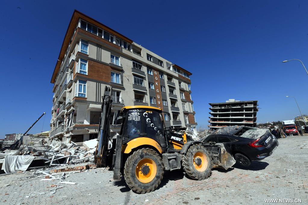 أنطاكية 10 فبراير 2023 (شينخوا) في الصورة الملتقطة يوم 9 فبراير 2023، آلة تنقل مركبة متضررة من الزلزال في مدينة أنطاكية بمقاطعة هاتاي جنوبي تركيا.