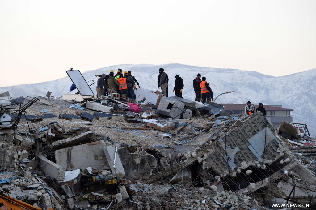 أنطاكية 10 فبراير 2023 (شينخوا) في الصورة الملتقطة يوم 9 فبراير 2023، عمال إنقاذ يبحثون عن ناجين بين أنقاض مبنى مدمر في مدينة أنطاكية بمقاطعة هاتاي جنوبي تركيا.