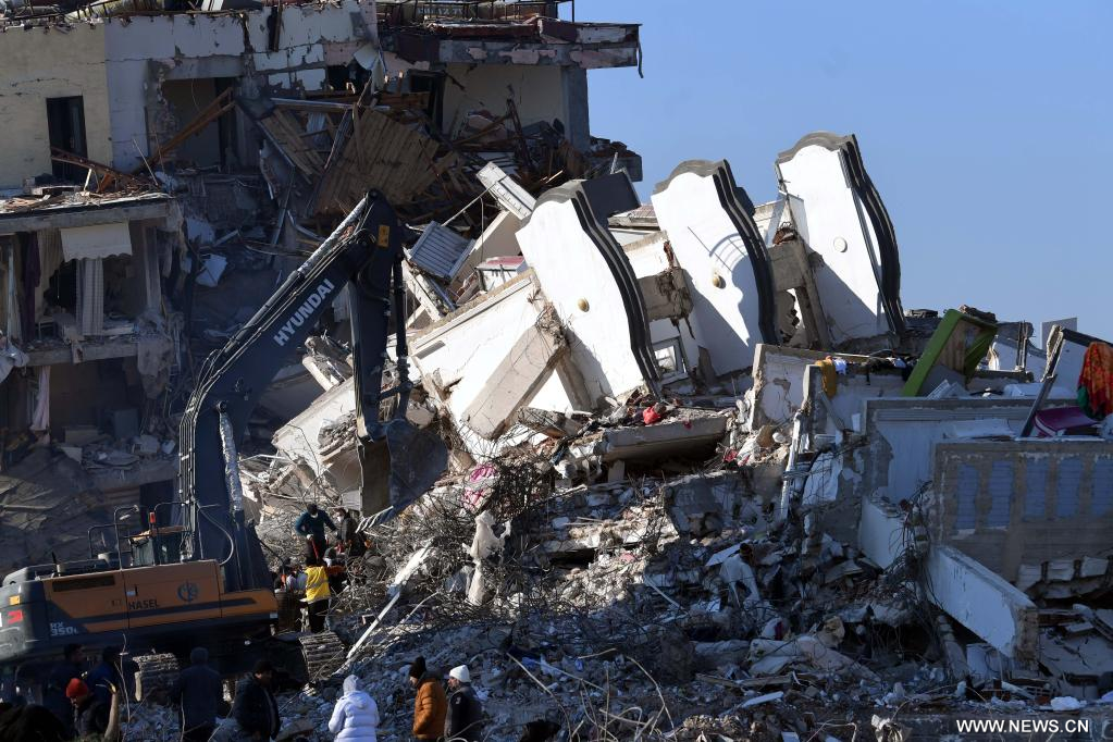 أنطاكية 10 فبراير 2023 (شينخوا) في الصورة الملتقطة يوم 9 فبراير 2023، آليات ثقيلة تُزيل الحطام من تحت أنقاض مبنى مدمر في مدينة أنطاكية بمقاطعة هاتاي جنوبي تركيا.