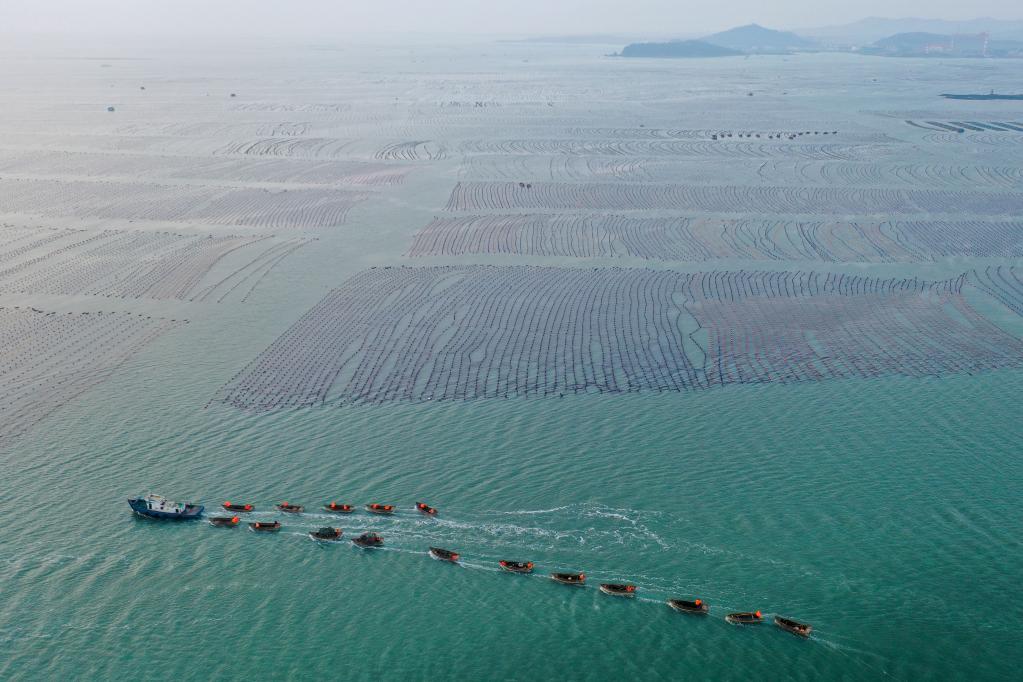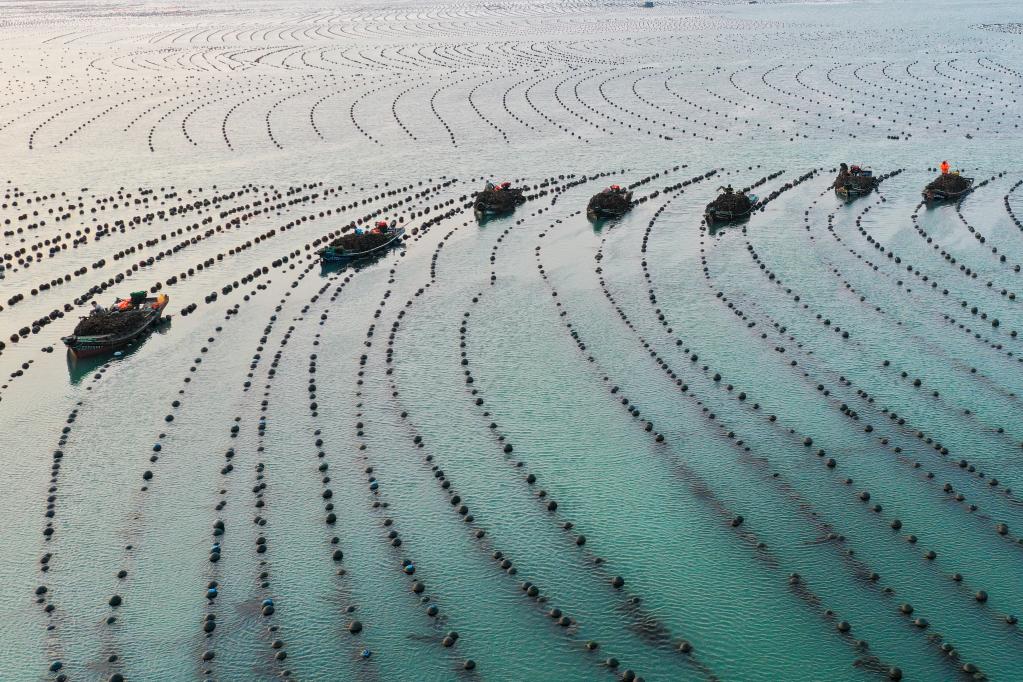 مشهد مزدحم في منطقة الاستزراع البحرية بمقاطعة شاندونغ في شرقي الصين