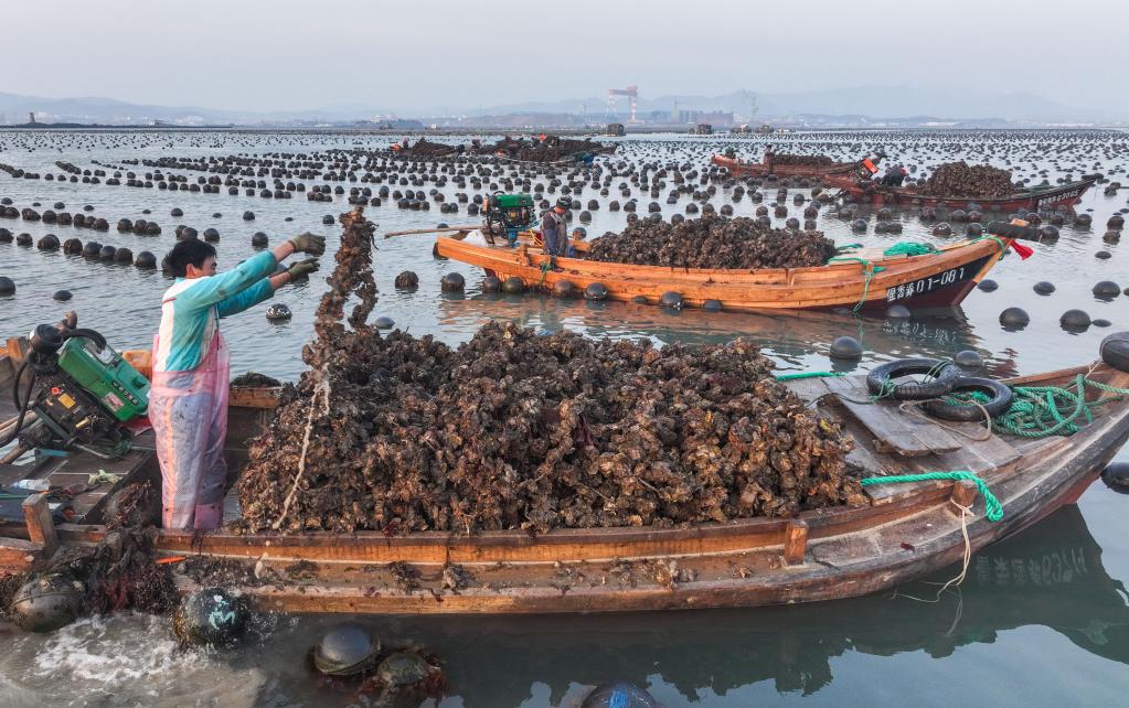 رونغتشنغ 18 فبراير 2023 (شينخوا) في الصورة الملتقطة يوم 17 فبراير 2023، صيادون يحصدون المحار في منطقة بحرية للاستزراع بمدينة رونغتشنغ في مقاطعة شاندونغ بشرقي الصين. هذا الوقت من العام، هو موسم إدارة وحماية مصايد الأسماك البحرية الربيعية في مدينة رونغتشنغ، حيث يقود عمال مصايد الأسماك القوارب ذهابا وإيابا في منطقة الاستزراع البحرية التي تضم أكثر من 400 ألف مو (المو الواحد يساوي نحو 667 مترا مربعا)، لاستبدال العوامات، ونثر الطُعم وغيرها من الأعمال، وهو مشهد مزدحم.