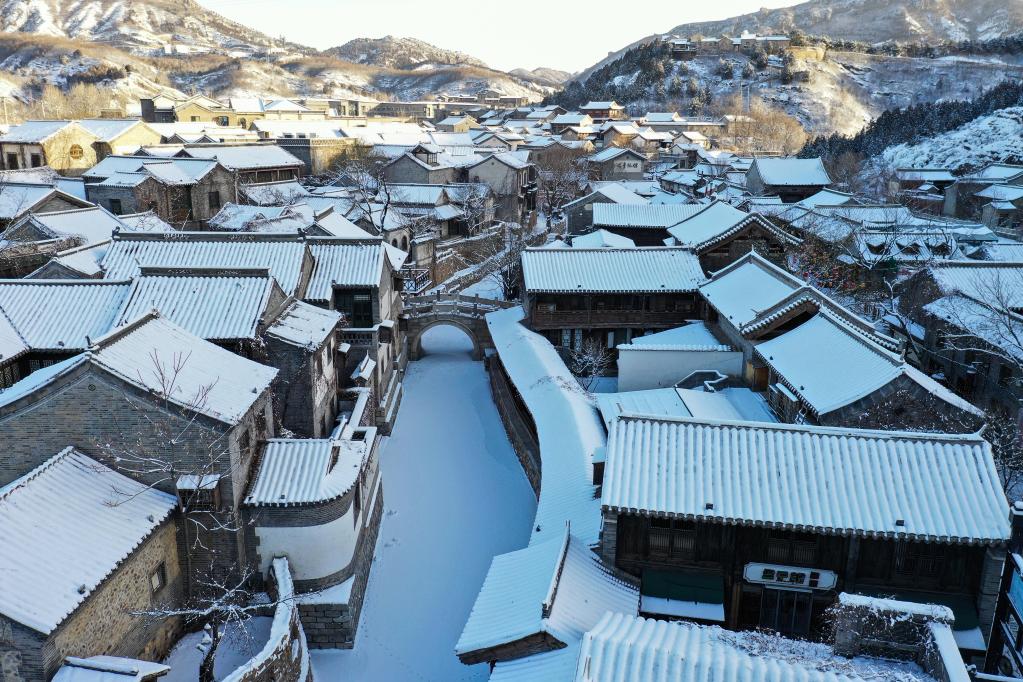 بكين 20 فبراير 2023 (شينخوا) في الصورة الملتقطة يوم 19 فبراير 2023، تصوير جوي يبرز لوحة طبيعية رائعة لبلدة قوبي المائية في إحدى ضواحي بلدية بكين بعد تساقط الثلوج.